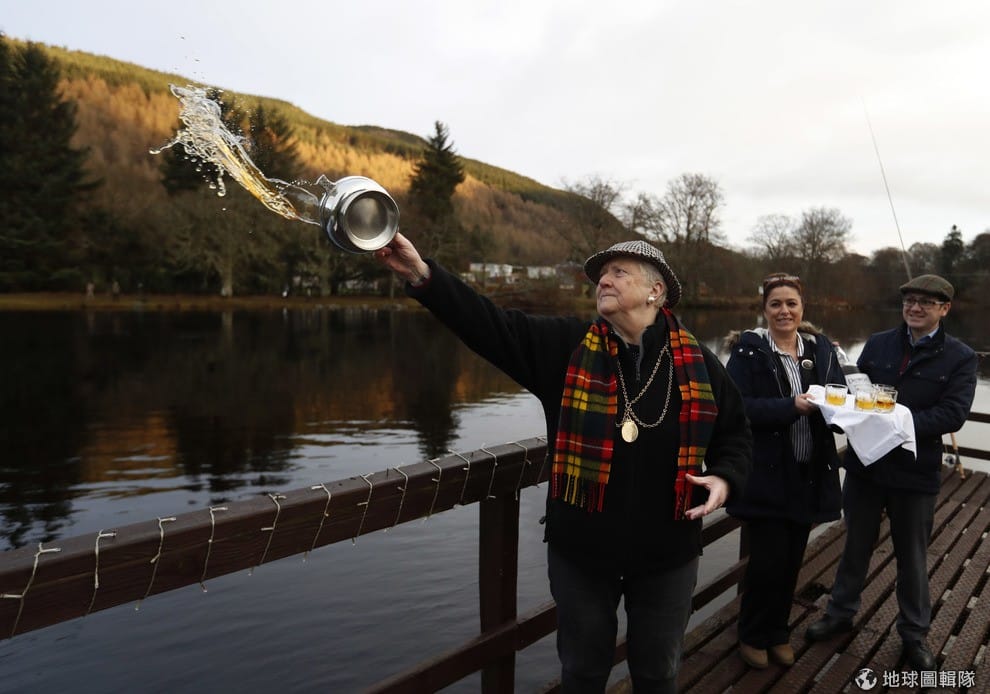 在蘇格蘭的提河(River Tay)旁,一名男子將威士忌灑入河中象徵對河流的祝福,也標示著釣鮭魚季的開始。