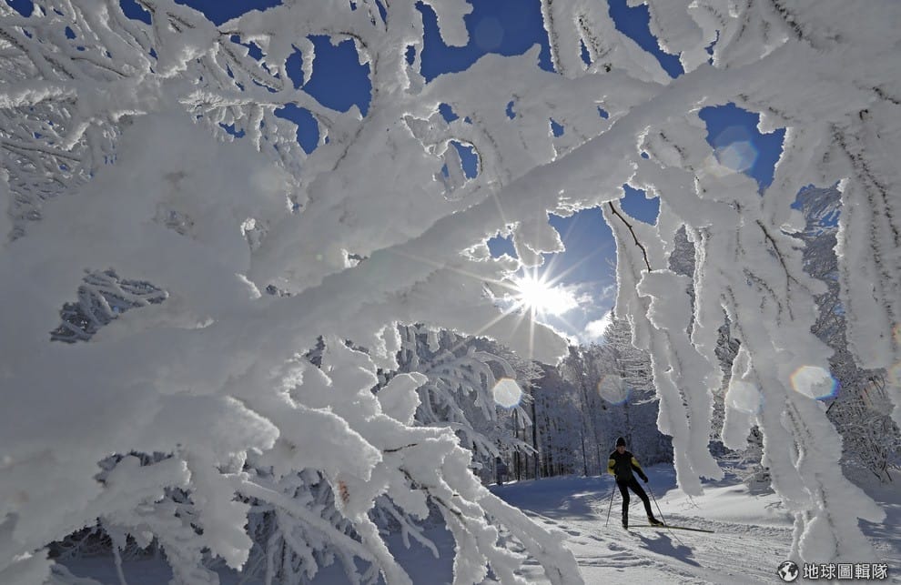 一名越野滑雪手趁著太陽高照的好天氣出門滑雪。