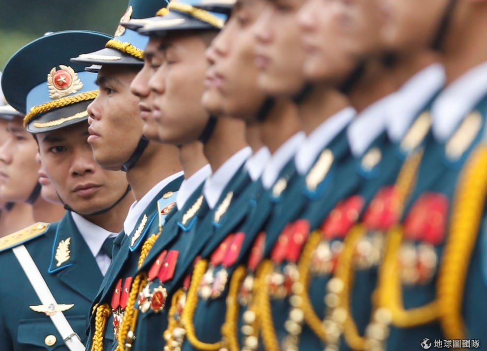 在越南首都河內的總統府前,一名軍官探出頭確認士兵的列隊完美無誤,他們準備迎接日本首相安倍晉三。