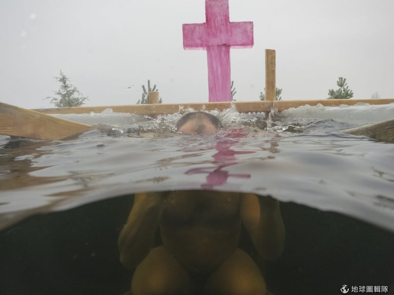 在烏克蘭,一名信徒把自己浸泡在冰水裡慶祝主顯節(Orthodox Epiphany)。