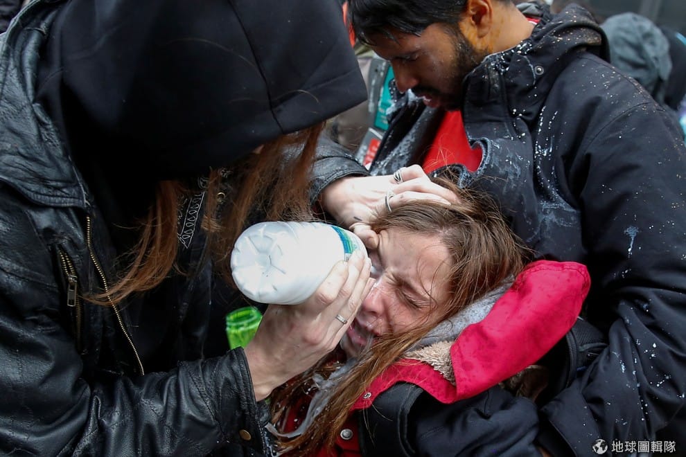 在美國總統川普(Donald Trump)就職典禮當下,許多人也在一旁抗議川普的上任。圖中一名抗議人士遭到鎮暴警察的胡椒噴霧攻擊後,趕忙到一旁清洗眼睛。