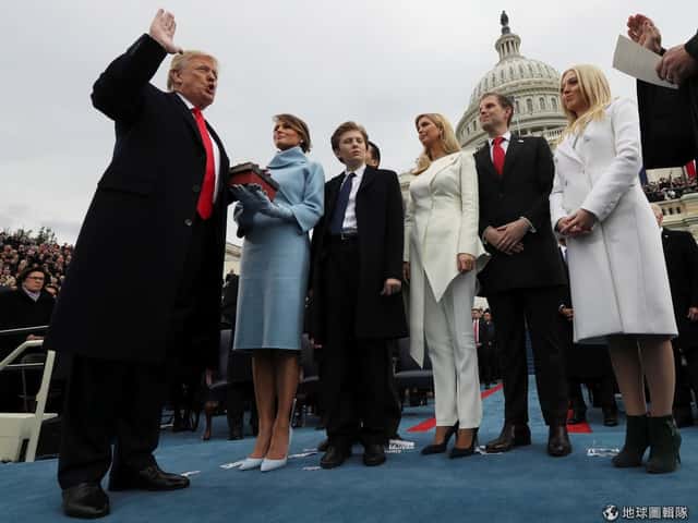 美國總統川普(Donald Trump,左一)將手放在聖經上,並在大法官羅伯茲(John Roberts,右一)的帶領下覆誦誓詞,正式成為美國第45任總統。
