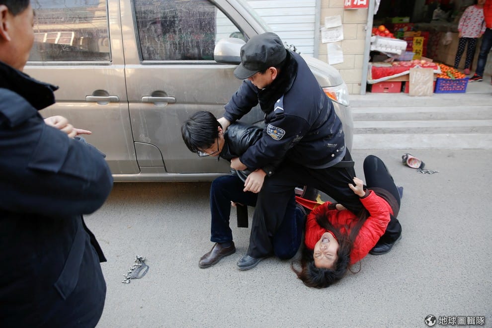 公安制伏了手持短斧的男子,他的老婆則躺在地上尖叫。這名夫婦因為任意把車子停在村子的主要幹道上而被罰了 500人民幣(折台幣約 2,300元),才會與公安發生衝突。