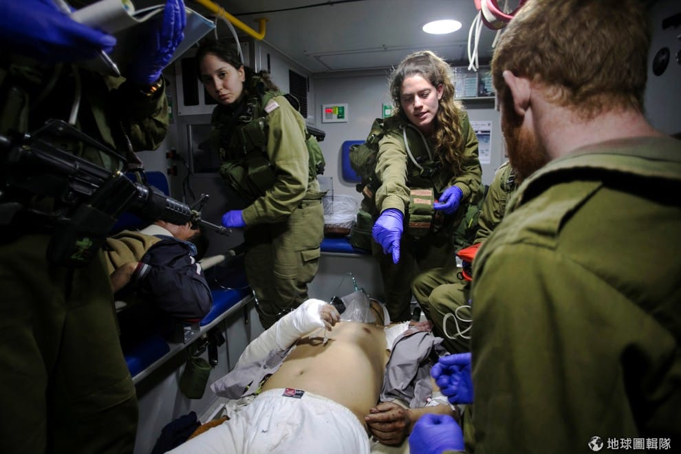 以色列軍隊在救護車上幫助受傷的敘利亞人,他們是在敘利亞與以色列的交界處發現該名敘利亞人。