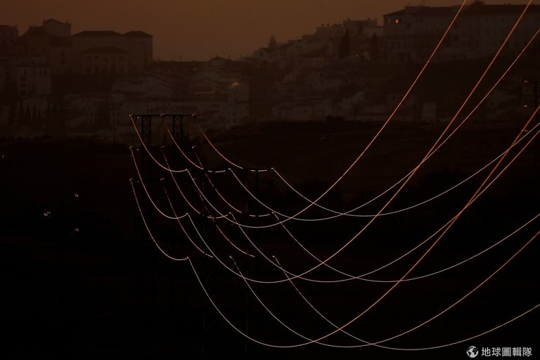 在西班牙中部城市龍達(Ronda)的變電所,可以看到高壓電纜線相互連接到彼端。
