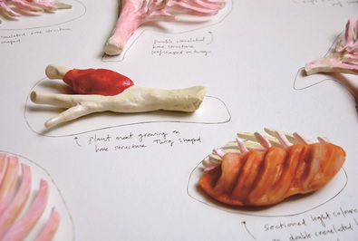 在「蔬菜骨頭(Plant Bones)」計畫中,她想像未來考古學家將發現蔬菜跟肉品一樣有骨頭、支架,藉此諷刺下一代將只吃像「肉」的食物。或是在「連接餐桌(Connecting Table)」計畫裡,長桌上覆蓋的白桌巾,居然是可以吃的薄餅!在加熱檯燈烘過一整晚後,配合薄餅下的熱湯,超過20人的食客共吃一份餐點。人們交互討論這普通薄餅,讓餐桌將所有同一張桌子的人連接起來。Vogelzang提醒人們,有人性的飲食方法,即回歸「共同用餐」,共同生活的核心價值。