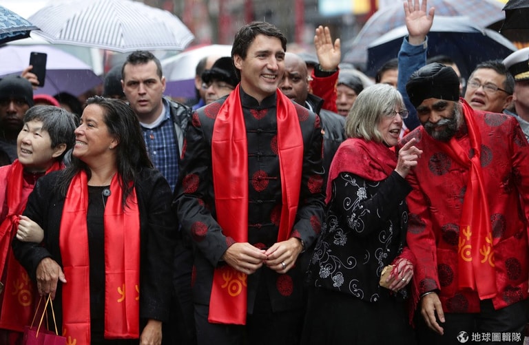 在全球華人重視的農曆新年,加拿大總理杜魯道(Justin Trudeau,中)穿上濃濃年味的唐裝,搭配上紅色圍巾,走在溫哥華街頭向民眾拜年。