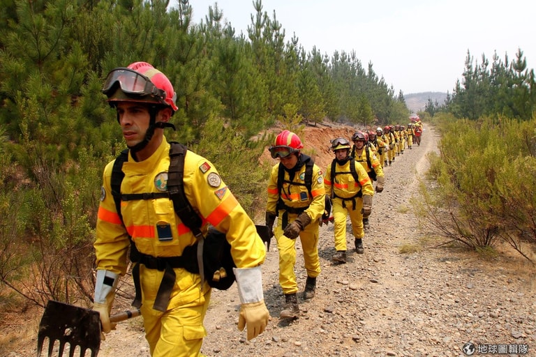 在智利中南部區域,一場熊熊烈火讓大批打火兄弟前往救災,他們全副武裝進入火場,希望能順利撲滅火勢。