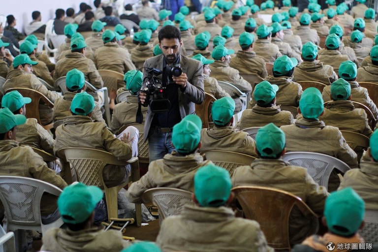 一名攝影師用鏡頭記錄下一群戴著綠帽的戰士,他們都是親反政府胡西組織(Houthi)的成員,在和當局的對戰中受傷。