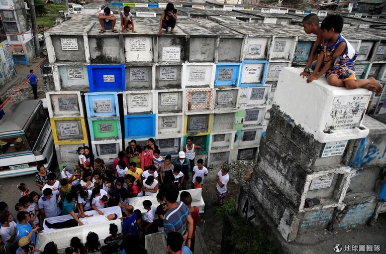 在首都馬尼拉北方的墓園中,因為當局大力緝毒而身亡的死者家屬齊聚一堂,悼念他們的親友。