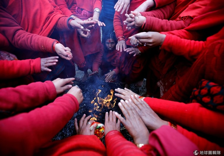 在卓弗連河畔(Triveny River),剛參加完聖浴的信徒聚在火堆旁烤火取暖,當地正值重要的「斯瓦斯阿尼節」(Swasthani Brata Katha festival)。