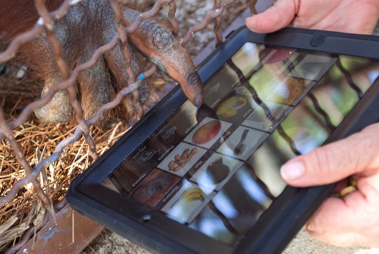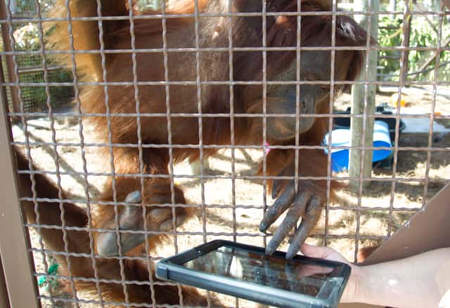 現在,對荷蘭動物園的研究人員來說,最大的問題就是要打造一個堅固耐用的觸控式螢幕,讓母紅毛猩猩珊博雅能放心地大滑特滑。演化心理學家范波羅提到,兩周前有一台平板成功通過兩隻紅毛猩猩的試驗,可惜這一台平板被珊博雅的媽媽珊蒂(Sandy)用壞了。