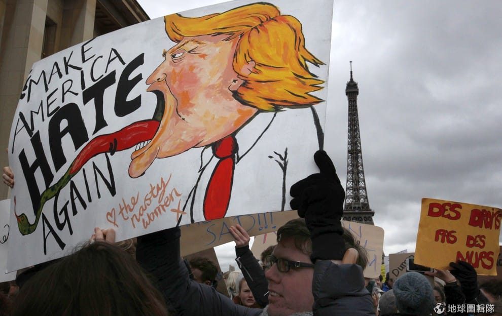 在巴黎鐵塔前,民眾們手拿嘲諷美國總統川普(Donald Trump)的海報,抗議他最近簽署的「移民禁令」,海報上寫著「讓美國再次仇恨」的字樣,這句話改編自川普競選時的口號「讓美國再次偉大」。