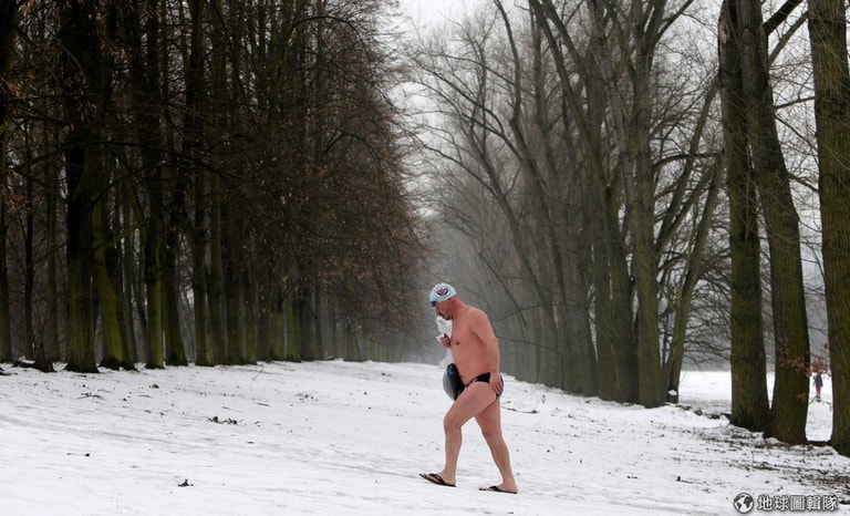 在天寒地凍的布拉格,一名參加冰泳俱樂部的男子從伏爾塔瓦河(Vltava river)上岸,只穿一條泳褲走在冰天雪地上準備回家。