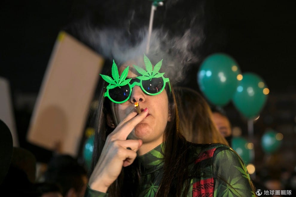 一名女子抽著大麻菸,戴著大麻葉造型的墨鏡,上街慶祝以色列當局將個人用大麻除罪化的政策。