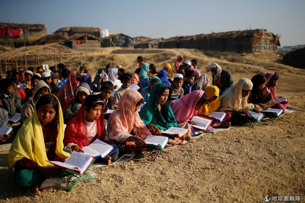 在孟加拉緊鄰緬甸的科克斯巴扎爾縣(Cox's Bazar),來自緬甸的洛興雅(Rohingya)難民小朋友在難民營中學習《可蘭經》。