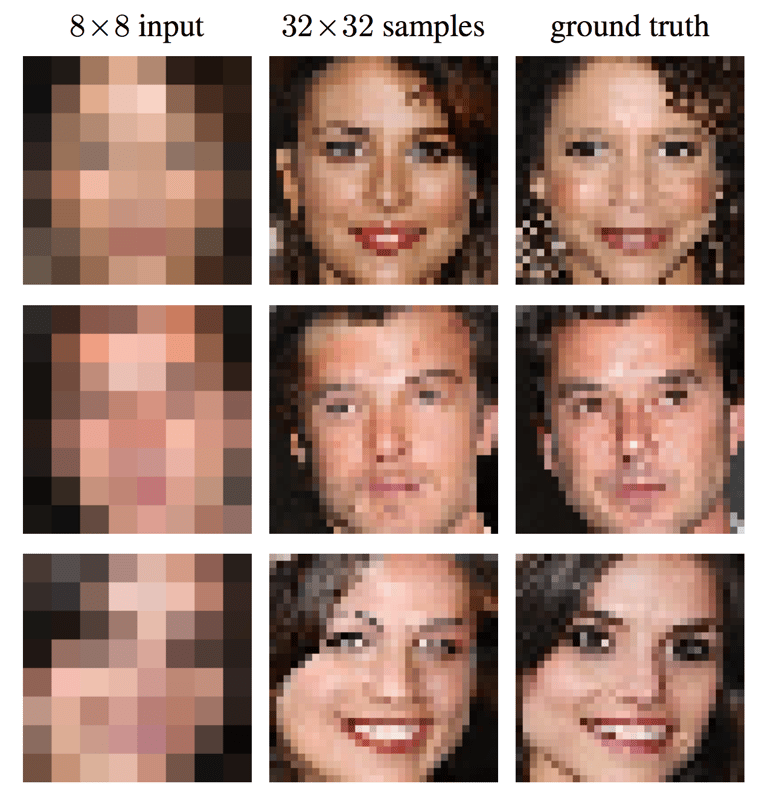 類似的劇情總會讓我們對這種不可思議的技術一笑置之,不過在近日,Google裡研究深度學習的團隊Google Brain表示,他們研發出新的AI技術,將 8x8的解析度提升成 32x32像素的圖像。