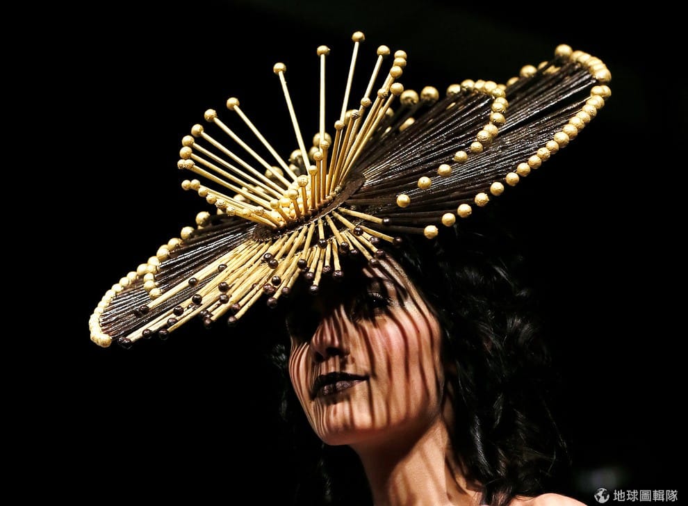 在以巧克力聞名的比利時,一名模特兒穿戴上以巧克力裝飾而成的衣帽,在巧克力大展上走台步。