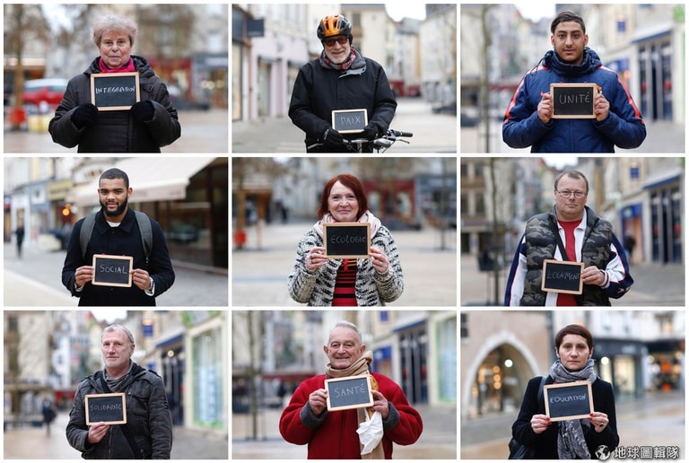 面對即將到來的法國大選,民眾手上拿著寫有關心議題的小黑板,表達對社會的重視,這些議題從公衛到經濟無所不包,當然還有法國的團結。