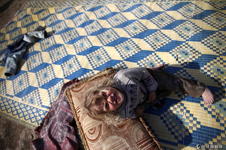 一名流離失所的小女孩,躺在草蓆上對著鏡頭微笑,這裡是過去 5年多來飽受戰火洗禮的敘利亞。