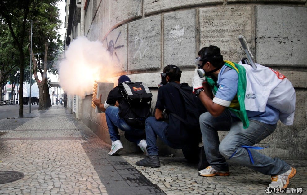 反政府份子蹲在里約熱內盧州州議會建築旁,對著遠遠走來的鎮暴警察發動攻擊,他們不滿當局大砍公共預算,犧牲人民的權益憤而走上街頭。