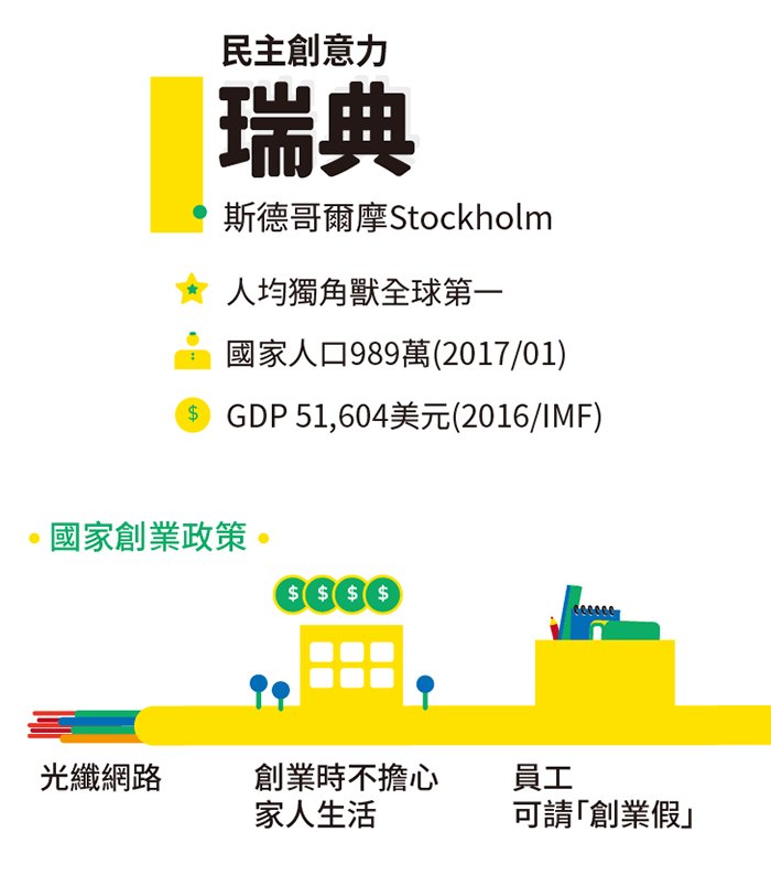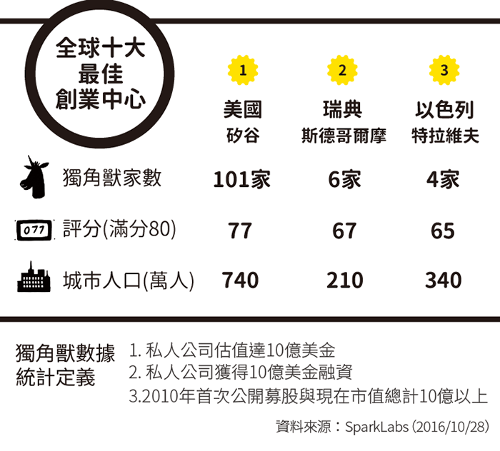 從國家平均人口來看,瑞典是產生獨角獸數量最多的地區,如Spotify、《糖果粉碎傳奇》(Candy Crush)開發商King和True Caller;而以色列卓越的技術開發能力,匯集全球超過兩百家企業研發中心進駐,創業密度全球最高。