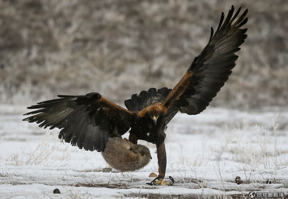 一隻金鵰敏捷地抓住了沙狐。哈薩克東部的Chengelsy Gorge正在舉辦一年一度的全國性狩獵大賽。