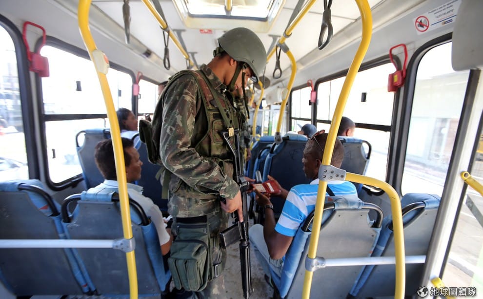 一名武裝軍人正在公車上盤查人們的身份。近日,聖埃斯皮里圖州(Espírito Santo)因為付不出給警察的薪水,造成警察集體罷工以示抗議,然而,警察罷工也讓當地瞬間出現執法真空,趁機作亂的犯罪組織甚至導致數十人死亡,讓巴西聯邦政府緊急派出 1,000名武裝軍人來協助維持境內治安。