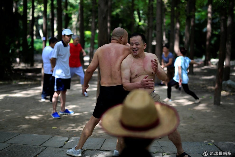 在上海的公園裡,兩名男子打著赤膊,在公園裡互相碰撞彼此的背部,作為一種舞蹈展現。