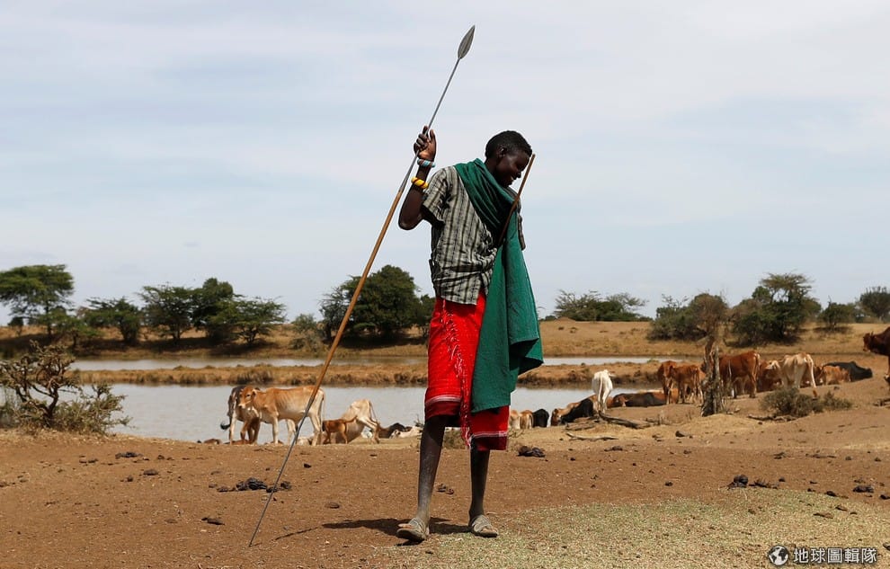 照片拍到一名Pokot族的部落男子手持長矛,在肯亞境內的Mugie保護區裡放牧。