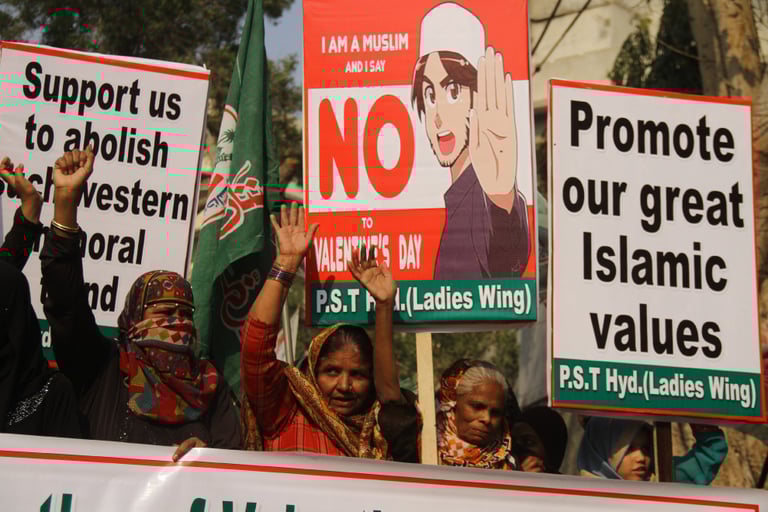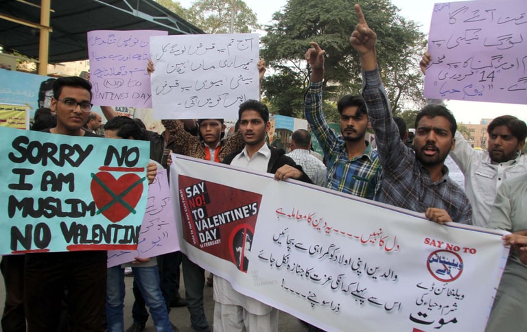 在伊斯蘭教信仰為大宗的巴基斯坦,某些人視西洋情人節為違反道德的象徵以及西方文化的入侵,過去就有伊斯蘭教團體大肆抗議慶祝西洋情人節。舉例來說,伊斯蘭教政黨jamat e Islami每到情人節都要上街抗議,反對慶祝 2月14日。