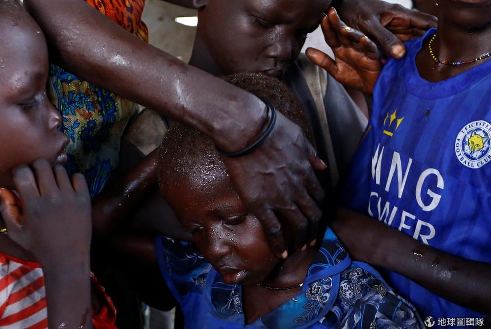 38歲的瑪庫兒(Nyagonga Machul,畫面中後方)緊緊抱著自己的 3個孩子,本來與孩子失散的她,在聯合國駐南蘇丹特派團(United Nations Mission in South Sudan, UNMISS)的「保護平民」(Protection of Civilian, CoP)營地內與孩子們重聚。