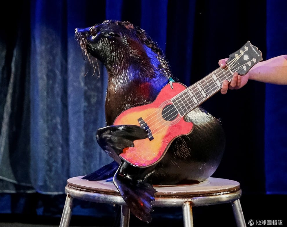 烏克蘭國家馬戲團在新秀「水與火」裡,獻上了海豹彈吉他的表演。
