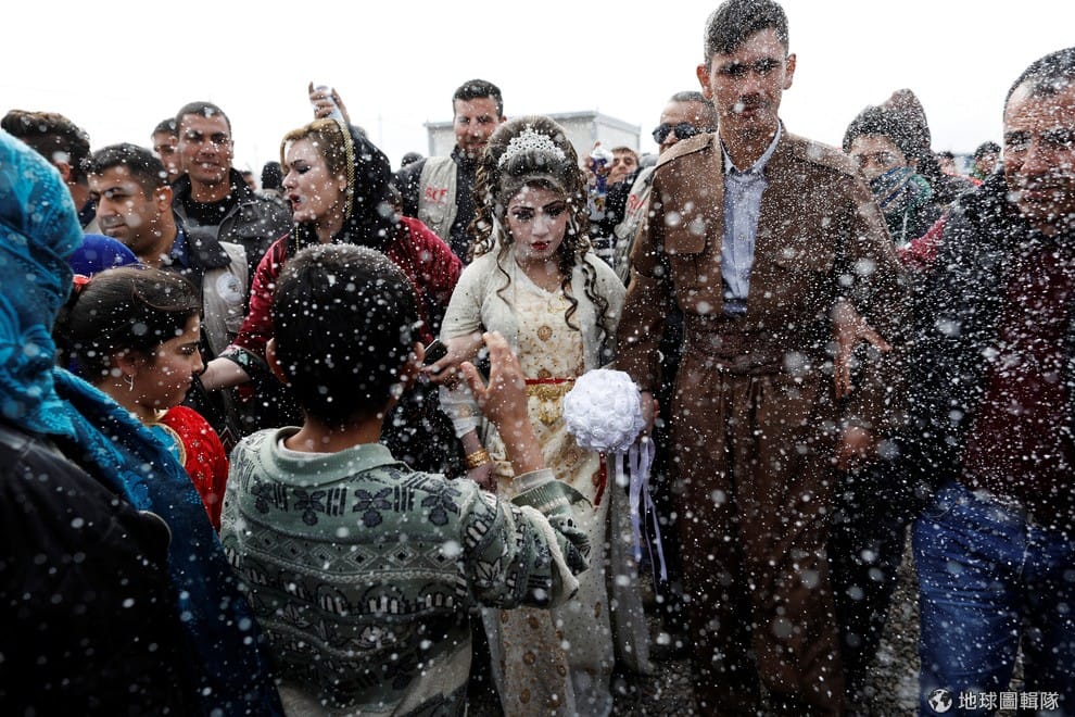 從摩蘇爾城(Mosul)逃出來的茲農(Hussain Zeeno Zannun,右)和夏涵(Chahad,左)在卡札(Khazer)難民營內結為連理,並沐浴在慶祝的泡沫裡頭。