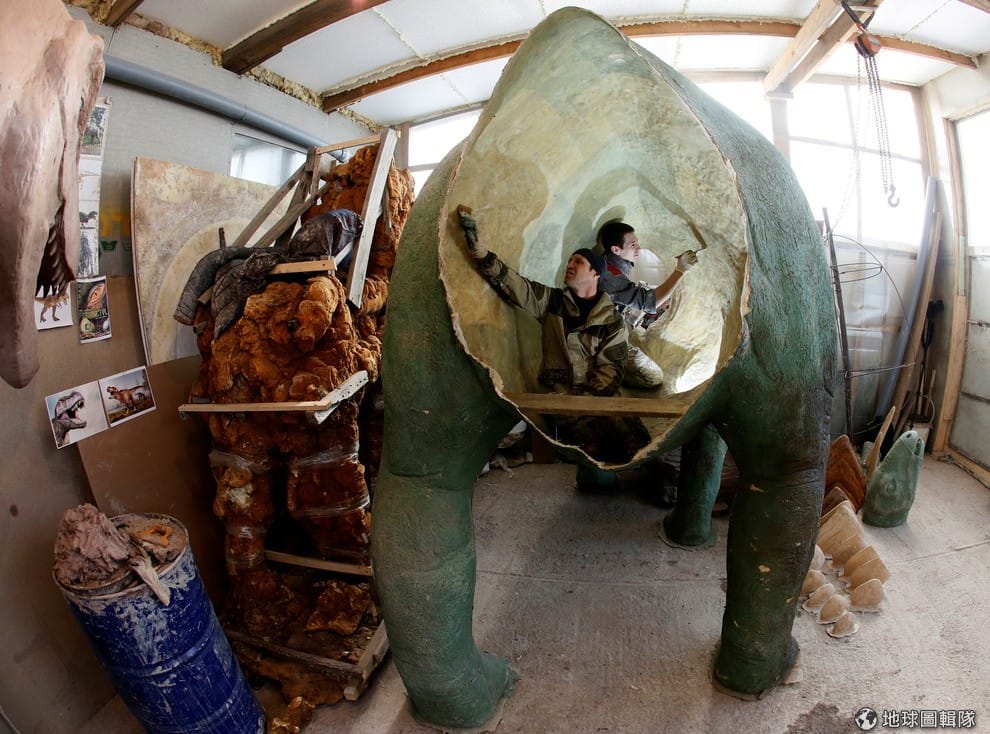 兩名工作室助手鑽進用聚氨酯泡沫塑料和玻璃纖維製成的恐龍雕像裡,從內部補強雕像結構。這間工作室專門為公園、私人住宅等空間製作各種材質的雕像。
