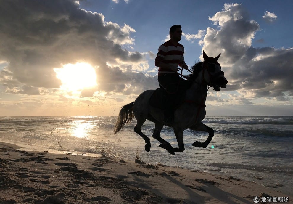 一名巴勒斯坦男子在約旦河西岸的海邊架馬奔馳著。