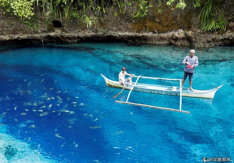 旅行社的員工划著菲律賓的特色小船螃蟹船(Banca Boat),來到著名的魔幻之河(Enchanted River)上方餵魚。魔幻之河因為美麗的顏色,成為許多觀光客心嚮往之的地方。
