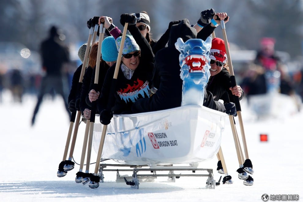 參加渥太華(Dows Lake)冰上龍舟比賽的參賽者,撐著划「槳」奮力在結凍的湖面上前進。