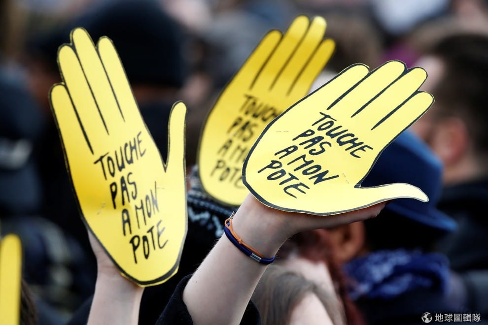 示威者聚集在巴黎共和國廣場,進行著反警察暴力示威,他們手上的標語寫著「不要碰我的朋友」。