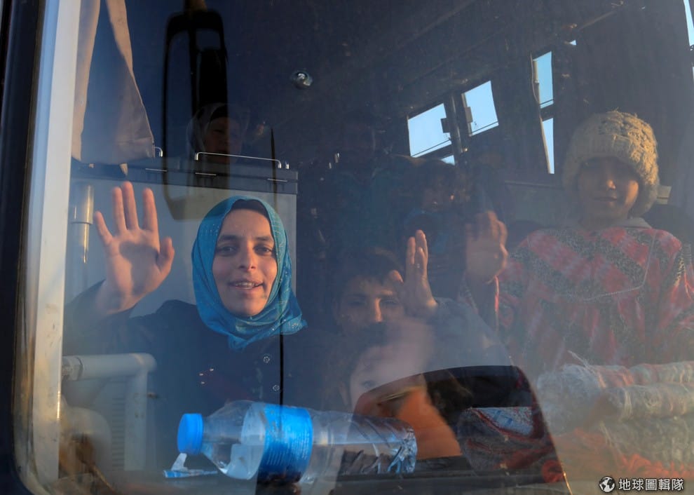 在摩蘇爾城(Mosul)南方,成功離開伊斯蘭國(IS)掌控區域的人民搭乘巴士準備前往難民營。