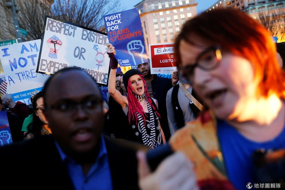 跨性別團體與支持者上街捍衛跨性別學生的權利,他們揮舞著彩虹旗,高喊著「沒有仇恨,沒有恐懼,這裡歡迎跨性別學生」。