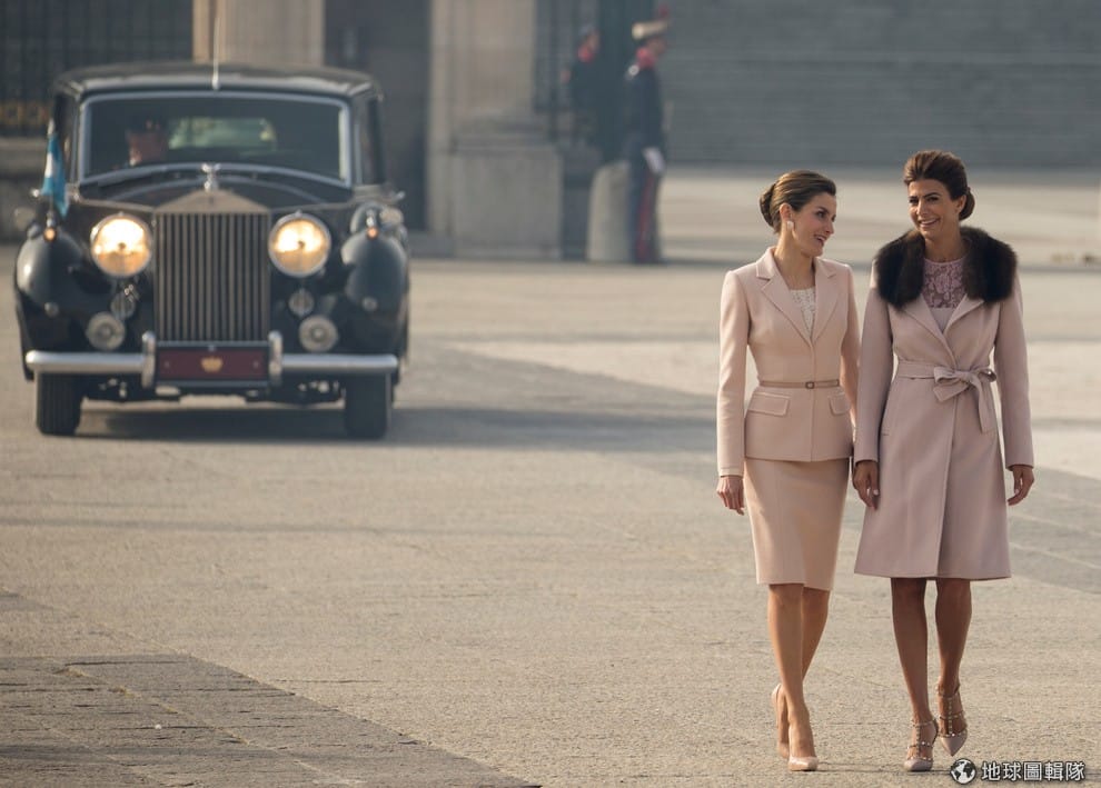 西班牙王后萊蒂西亞(Queen Letizia of Spain,左)接待阿根廷第一夫人阿瓦達(Juliana Awada,右)前往馬德里王宮(Palacio Real de Madrid),準備一同參加歡迎典禮。