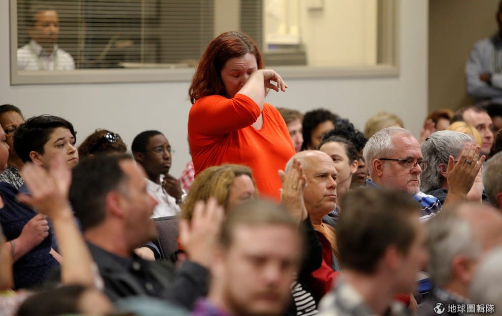 穿著橘色上衣的史密斯(Janene Smith)在南卡羅來納州北查爾斯頓(North Charleston)參議員史考特(Tim Scott)舉辦的協商會上,談到健保時忍不住哭泣。