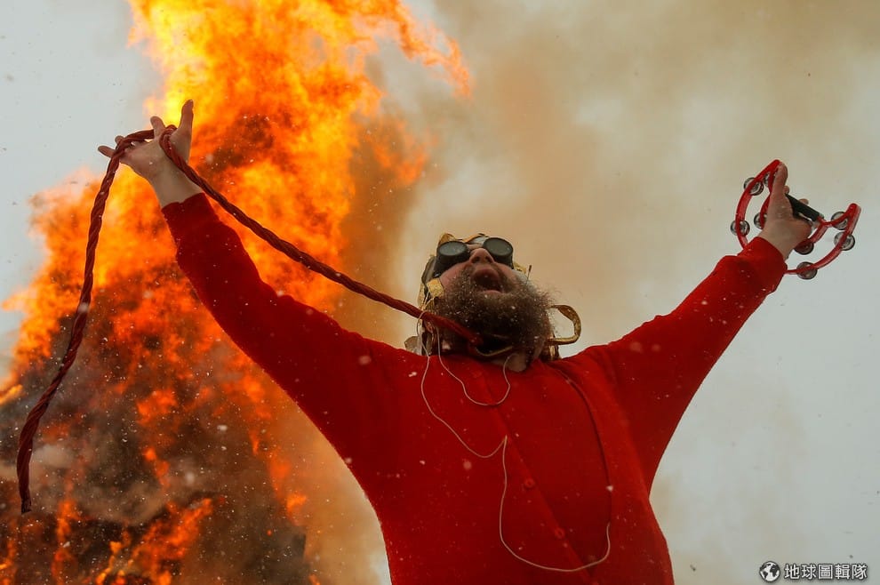 俄國藝術家維諾管道夫(German Vinogradov)在熊熊燃燒的謝肉節(Maslenitsa)塔前表演,慶祝薄餅周(Pancake Week)的結束,人們準備送走冬天迎來生機蓬勃的春天。