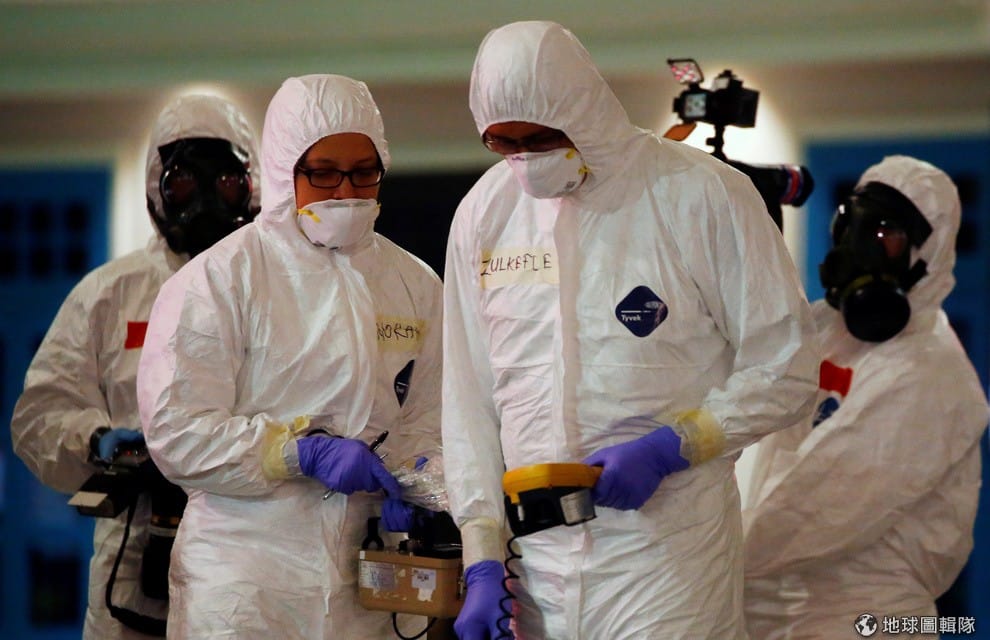 一群全副武裝的調查員在金正男遇害的馬來西亞吉隆坡國際機場,拿著機器蒐集任何蛛絲馬跡,希望可以還原金正男遇害當天的現場。