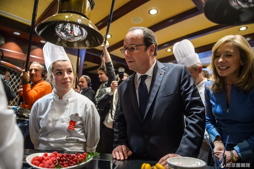 25號這天是巴黎迪士尼渡假村滿 25周年的日子,法國總統歐蘭德(Francois Hollande, 中)在歐洲迪士尼集團主席鮑薇爾(Catherine Powell, 右)的陪伴下,享受渡假村內廚房學徒煮出的餐點。
