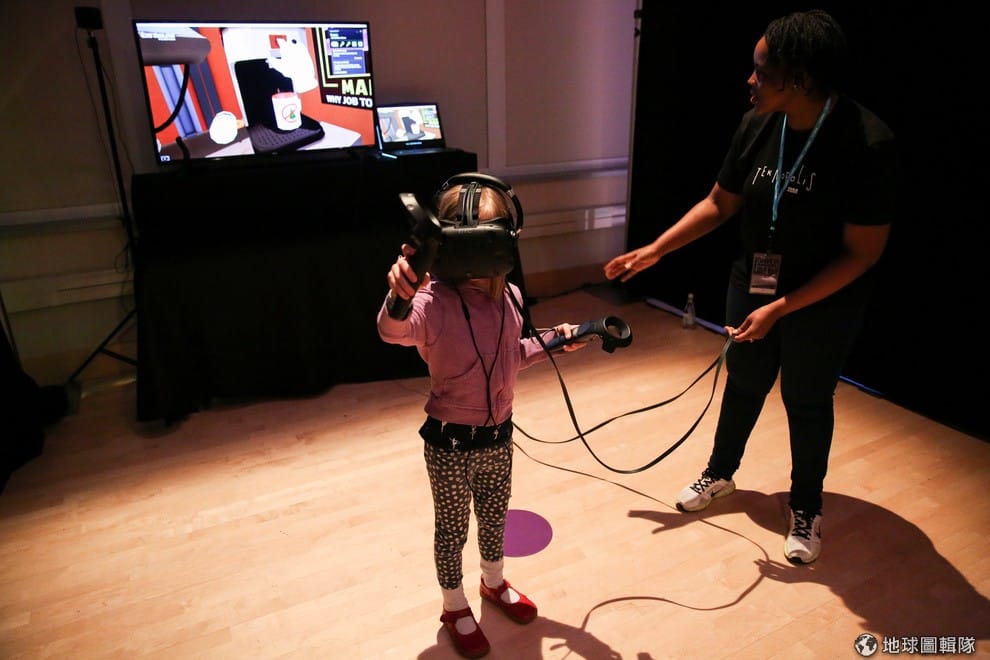 今年 7歲的嬌韓森(Cecelia Johnston)在藝術科技展上大玩職業模擬虛擬實境遊戲,搶先體會出社會工作的滋味。