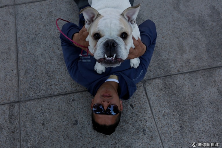 26號這天,900隻英國鬥牛犬上街遊行,希望可以打破最多英國鬥牛犬上街的金氏世界紀錄。圖為一名和自家鬥牛犬玩得不亦樂乎的主人。