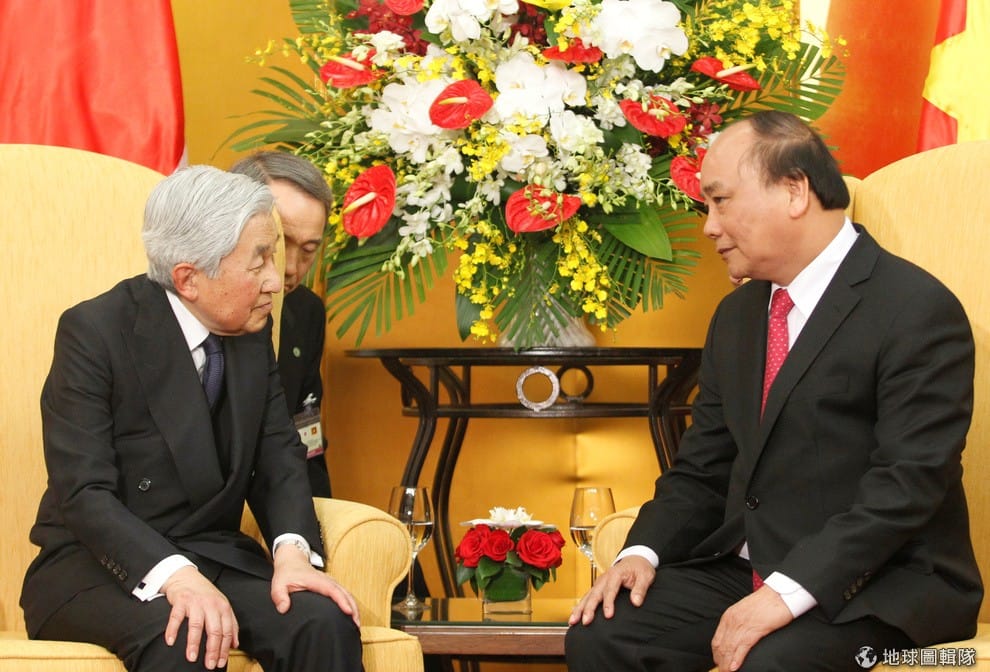 日本明仁天皇(左)來到越南,和越南總理阮春福(右)會面,明仁天皇這一趟出訪還拜訪了住在越南的日本二戰遺族。