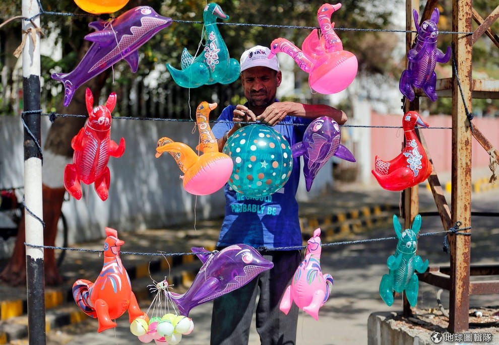 在印度第七大城艾哈邁達巴德(Ahmedabad),一名小販在路邊展示五彩繽紛的充氣玩偶,等著客人上門把它們帶回家。